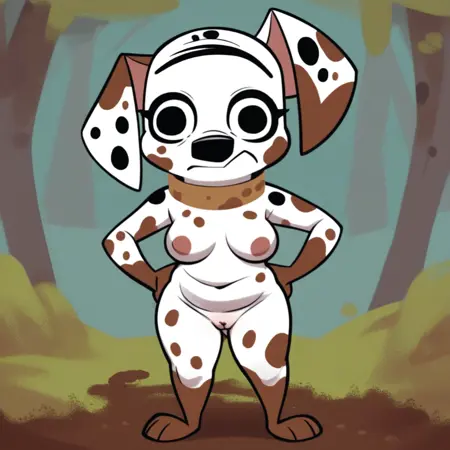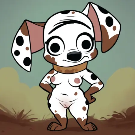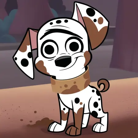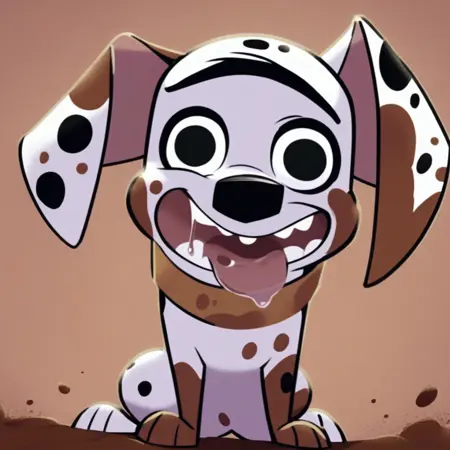 Dog, dalmatian, white and black fur, black spots, spots of mud, unfocused eyes, black eyes, unibrow, large ears, curled tail, brown collar,