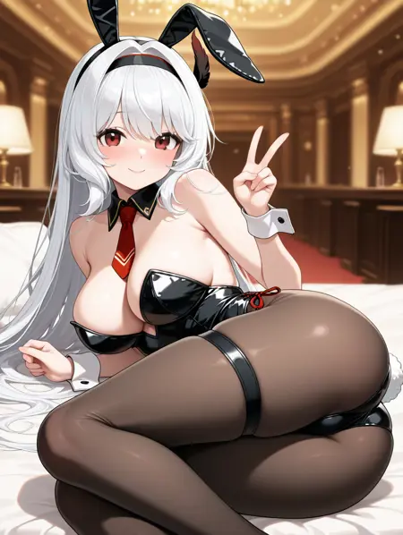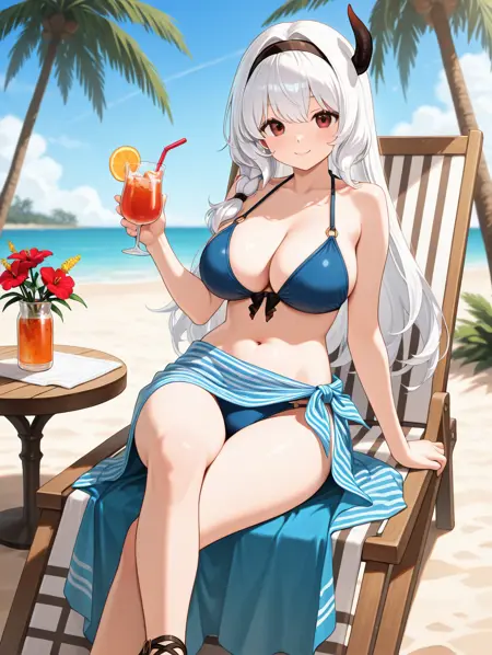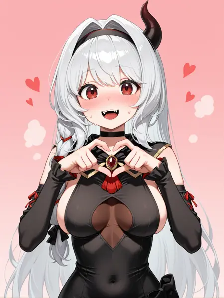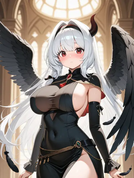 priscilla, 1girl, solo, long hair, white hair, hairband, horns, sideboobs, black hairband,