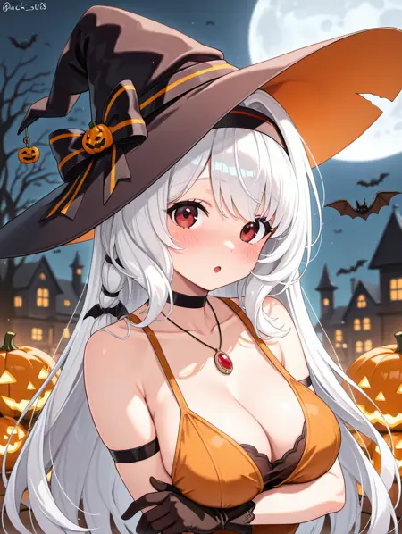 priscilla, 1girl, solo, long hair, large breasts, red eyes, gloves, hat, dress, cleavage, bare shoulders, jewelry, medium breasts, very long hair, white hair, hairband, sleeveless, choker, black gloves, necklace, black headwear, witch hat, sleeveless dress, black choker, moon, hat bow, pendant, halloween costume, arm strap, orange dress,
