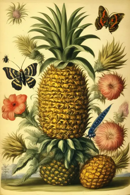 她最杰出的成就之一是1705年出版的著作《苏里南昆虫的变态》(Metamorphosis insectorum Surinamensium)。该书记录了她前往荷兰殖民地苏里南的考察之旅,在那里她研究并绘制了当地丰富的昆虫物种。她的插画极其细致,不仅描绘了昆虫,还展现了它们寄生的植物,强调了自然界各要素之间的相互联系。