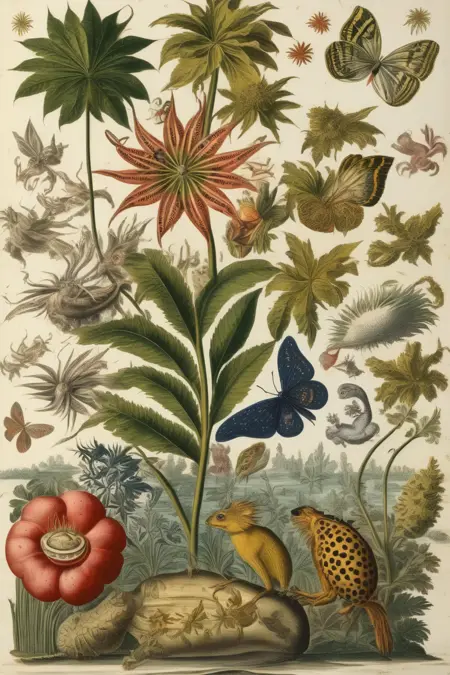 梅里安对自然世界的兴趣始于幼年,她开始收集和研究昆虫,观察它们的生命周期及与植物的互动。她的观察挑战了当时盛行的观念,推动了人们对昆虫变态过程的理解。