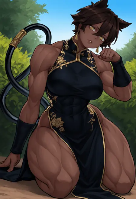 主版本 - "深色皮肤女性,耳毛,黄眼睛,竖瞳,深棕色短发,发丝遮眼,尾巴,尾环,大胸,肌肉发达"
