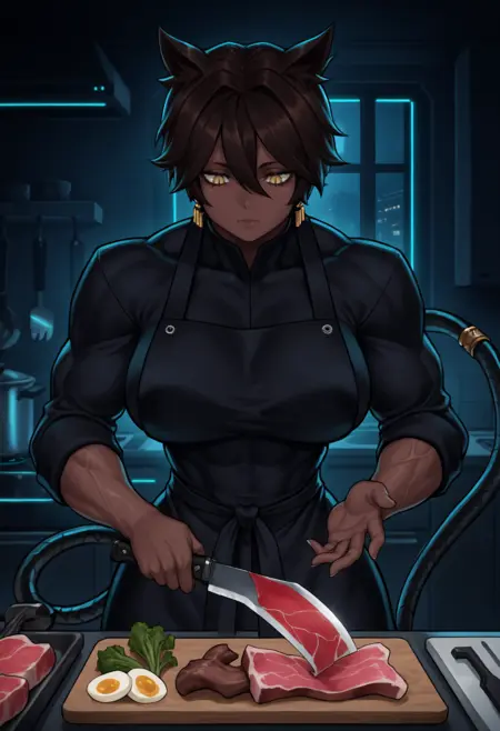 备用版本 - "深色皮肤女性,耳毛,蓝眼睛,竖瞳,黑发短发,发丝遮眼,电缆尾,尾环,大胸,肌肉发达"