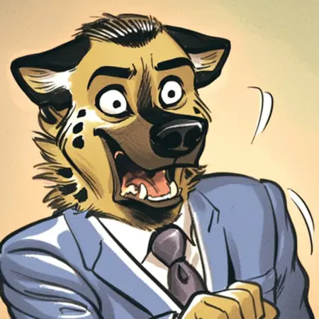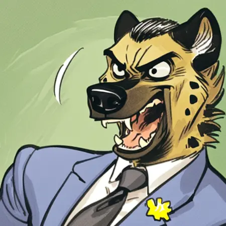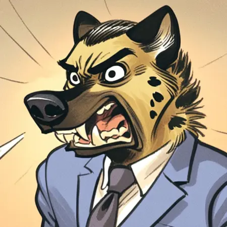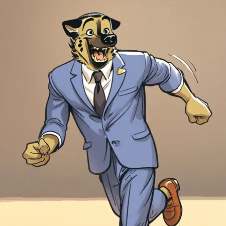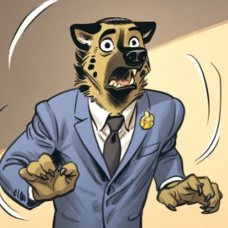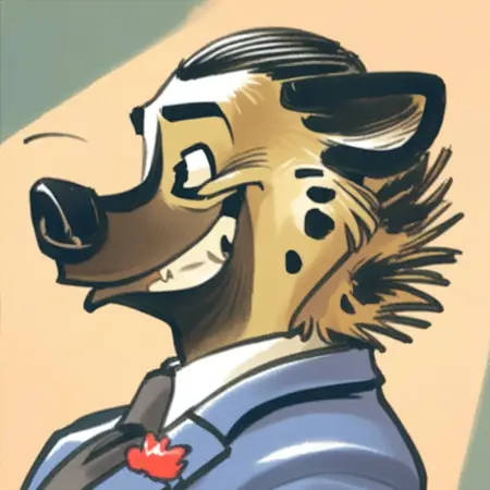 N3AL_B3ato, Beato, Blacksad, 1 boy, furry male, anthro hyena, spotted hyena, tan fur, brown snout, black spots, black hair, black nose, black eyes, black hair, slick-back hair, combed back hair