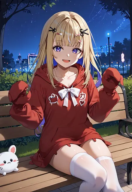 + ShiinaCrab, hood, bangs, hair ornament, red hoodie, long hair, blue eyes, blonde hair, hood up, long sleeves, hair clip, thighhighs, purple eyes, sleeves past wrists, multicolored hair, white bow, collarbone, hood down, colored inner hair,