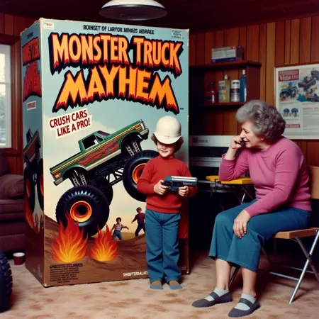 장난스러운 시나리오: 이 과장된 장난감들을 일상적인 환경과 대비시켜 유머러스한 대비를 창출합니다. 예를 들어, 어린이가 거대한 로봇과 상호작용하는 동안 성인은 평온하게 신문을 읽고 있습니다.