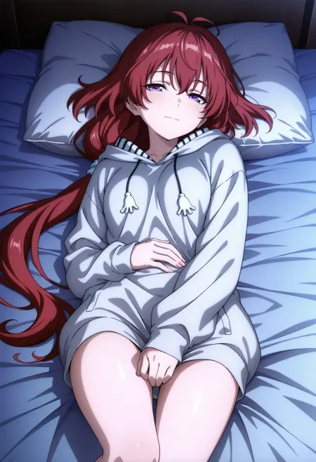 Base: renboukouji_akiravv, 1girl, anime coloring, solo, low-tied long hair, antenna hair, red hair, purple eyes, hoodie, grey hoodie, drawstring, very long hair, small breasts,