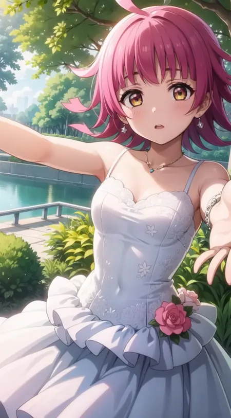 你需要的标签:1girl, solo, 天王寺璃奈, 短发, 粉色头发, 天线辫