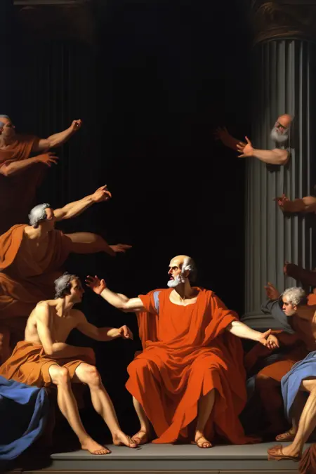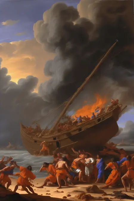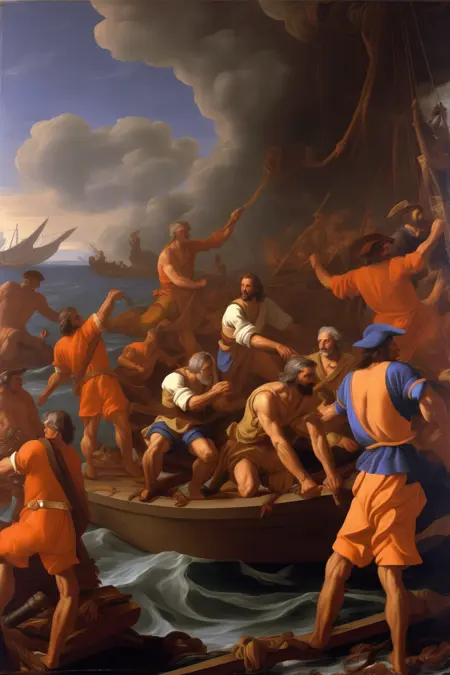 푸생은 고대 고전, 신화, 성경적 주제에서 영감을 받았으며, 자신의 회화에 종종 역사적 및 우화적 요소를 포함했다. 그는 정확한 선과 인물 및 사물의 신중한 배열을 통해 조화롭고 균형 잡힌 구성물을 창조하려 했다.