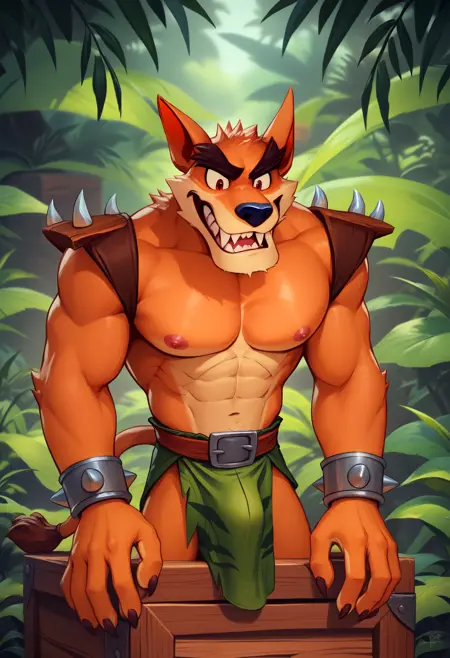 tiny_tiger_(crash bandicoot), tiger, orange fur, red eyes, pauldrons,bara, topless,