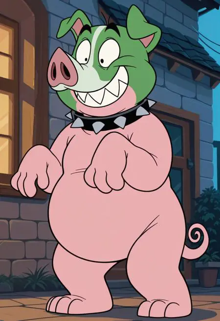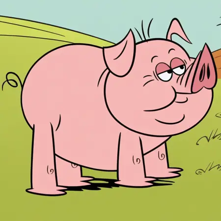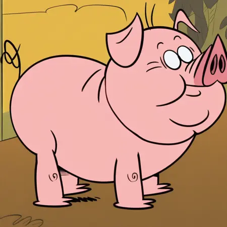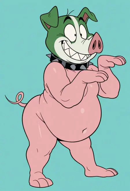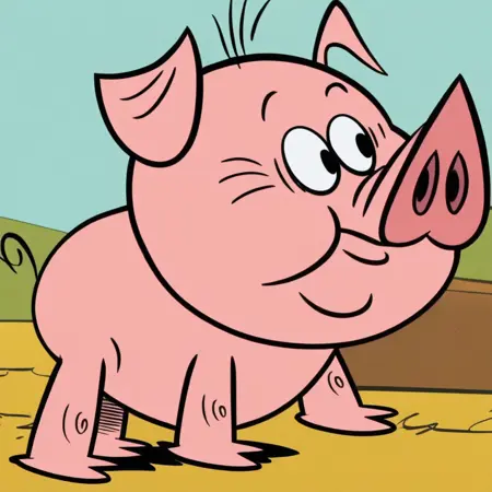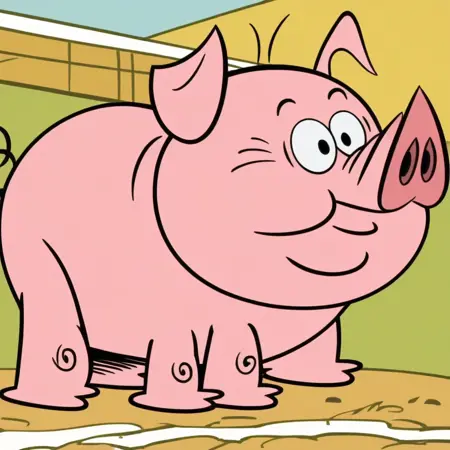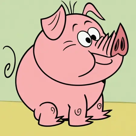 Prompt: virginia, solo, cartoon, animal pig, pink skin, plump, black eyes, snout, curly tail, pig, smile, full body