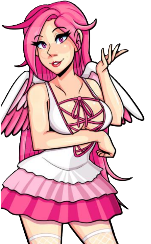 Picture4 Roselyn Angel Costume : 1girl, solo, breasts, large breasts, pink eyes, lipstick, long hair, pink hair, white and pink wings, cleavage, white thighhighs, frilly white and pink short dress, white and pink dress