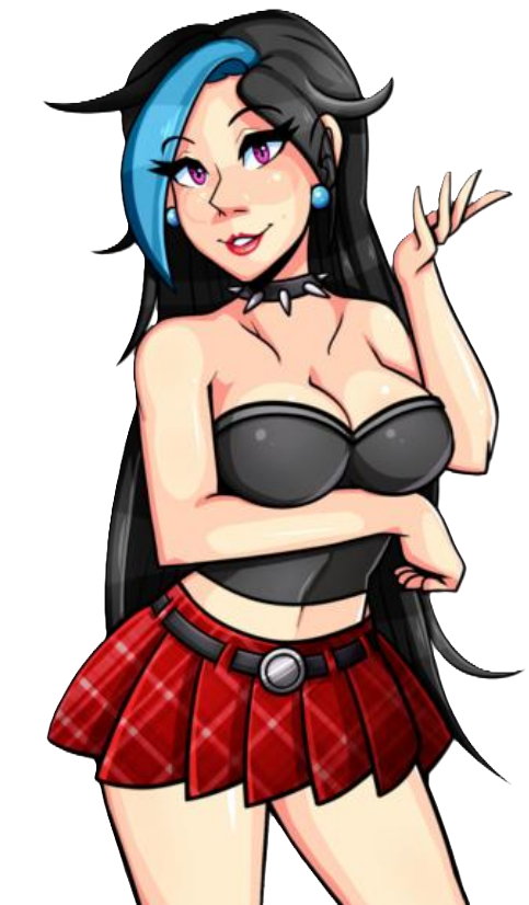 Picture6 Roselyn Rachel Costume : 1girl, solo, breasts, large breasts, pink eyes, lipstick, long hair, multicolored hair, black hair, blue highlights, spikes necklace, black shirt, midriff, sleeveless off shoulder top, cleavage, plaid skirt