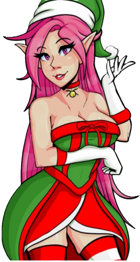 Picture5 Roselyn Elf Costume : 1girl, solo, breasts, large breasts, pink eyes, lipstick, long hair, pink hair, pointy ears, green and red dress, sleeveless off shoulder top dress, cleavage, striped red and white thighhighs, elf hat, white gloves