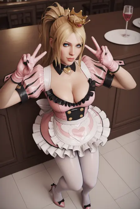 long hair, blue eyes, blonde hair, ponytail, hair between eyes, pink gloves