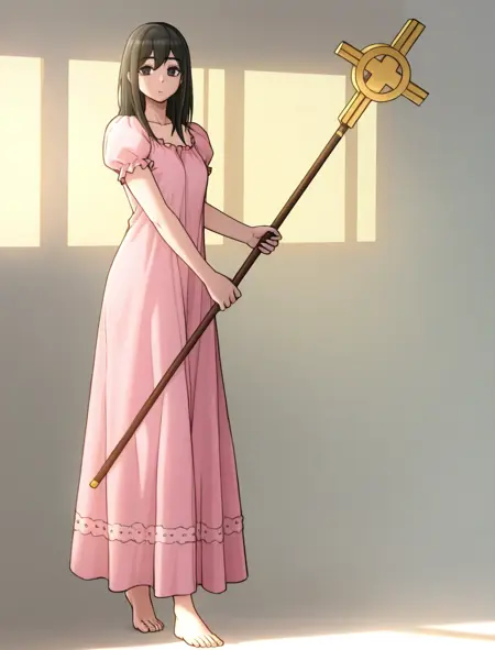 pink nightgown, barefoot
