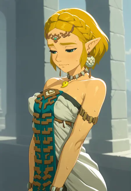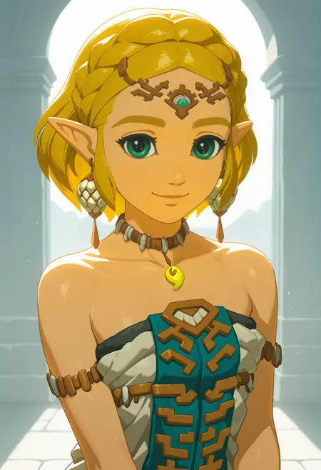 1girl, princess zelda, ブロンドの髪, 尖った耳, totk, 短い髪, 額の宝石, 魔玉のネックレス, 耳飾り, 肩を露出, 白いドレス