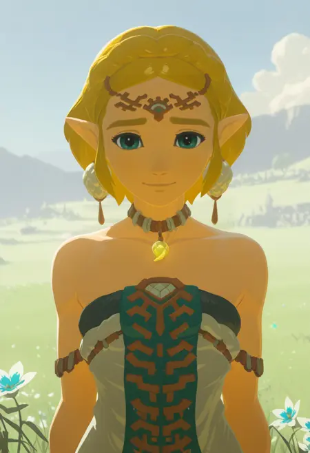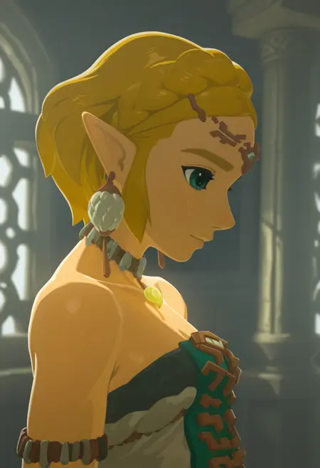 1girl,塞尔达公主,金发,尖耳,TOTK,短发,额头宝石,勾玉项链,耳环,裸露肩膀,白裙