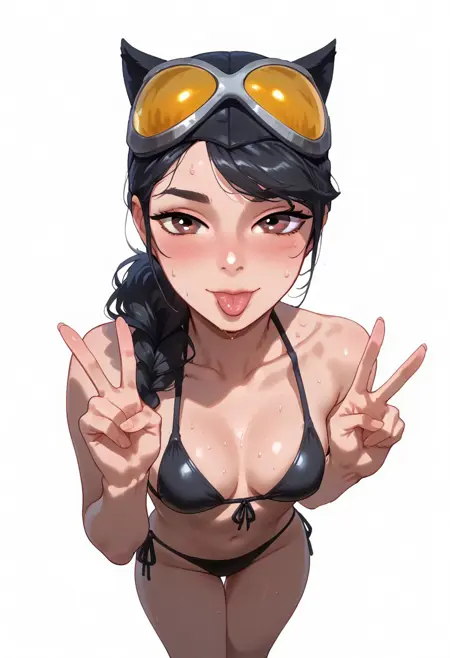 CatwomanComicBook、茶色い目、黒髪、黒いマスク、頭にゴーグル、動物の耳、黒いボディスーツ、ラテックス、ベルト、手袋、レザーブーツ