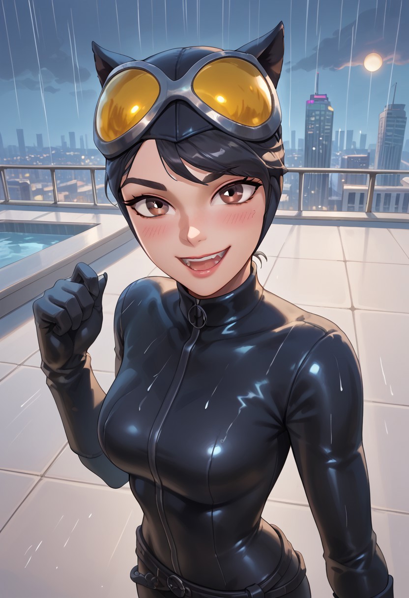 CatwomanComicBook, brown eyes, black hair, black mask, goggles on head, animal ears, perfect body,