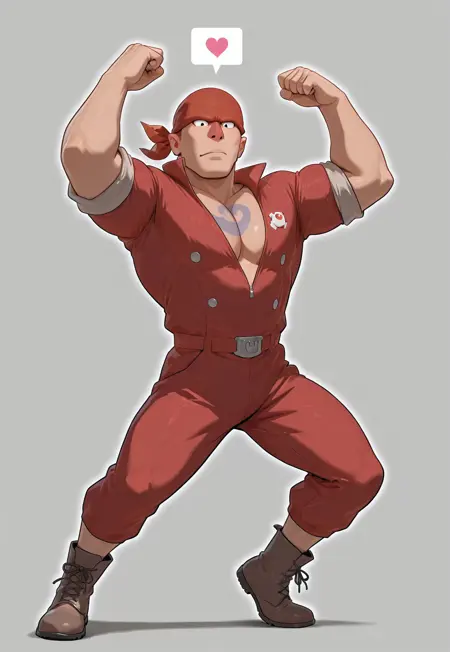 red bandana with white symbol,wine red jumpsuit,rolled up sleeves,boot
