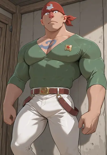 red bandana,green shirt,blown belt,white pant,