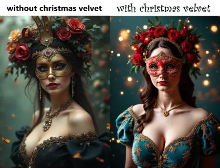 this LORA is designed to generate images featuring soft velvet textures, plush elements, winterly ornamets and a festive Christmas ambiance. Works great with everything red and black, winter and snow, fabric material, soft surface, Christmas and holiday season. Perfect for bringing warmth and elegance to your designs.