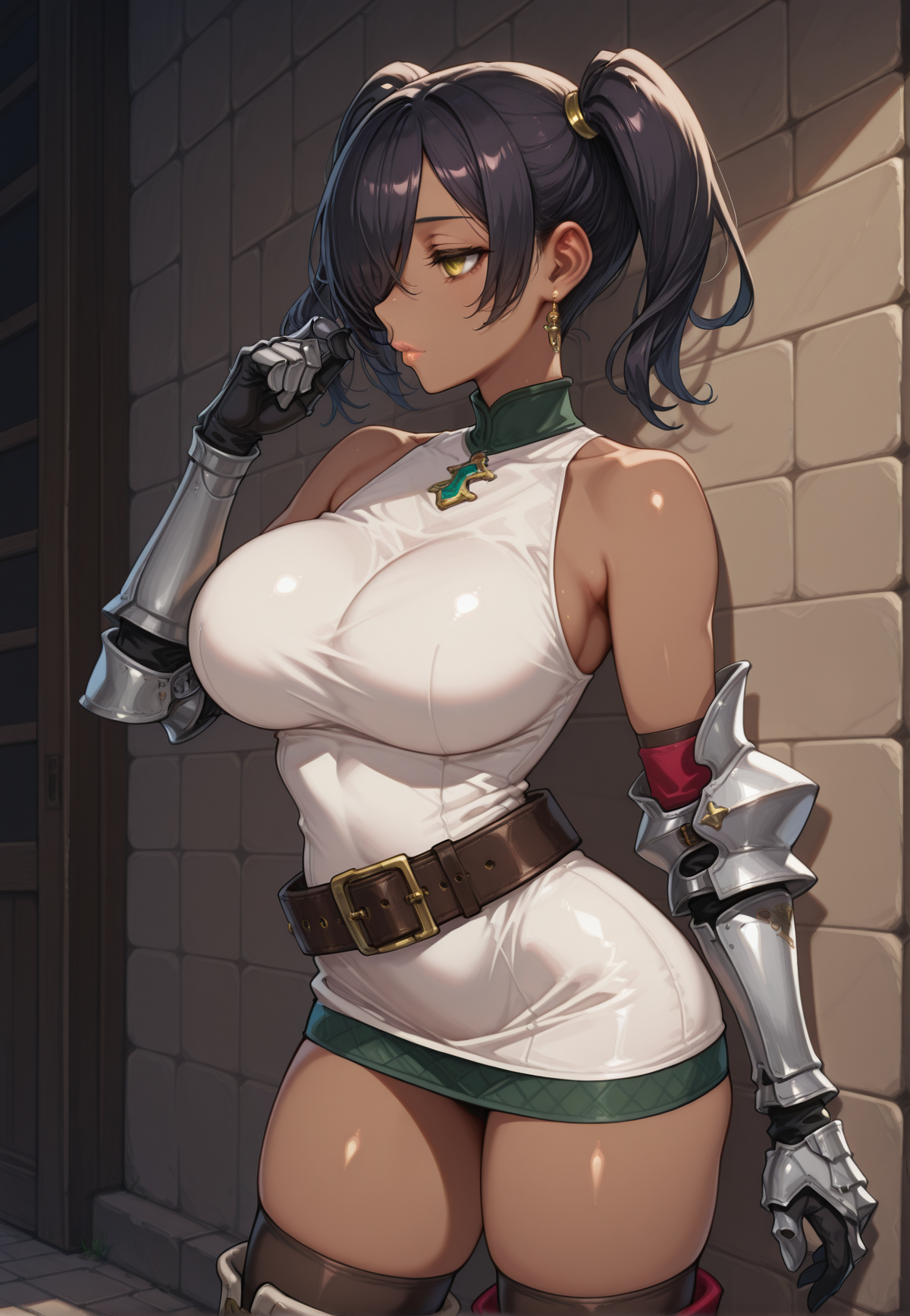 、黒髪、ツインテール、太ももハイズ、ベルト、ブーツ、片目に髪がかかる、垂れ目、ワンピースドレス、ノースリーブ、ガントレット、金色の目、中程度の胸、唇、濃い肌