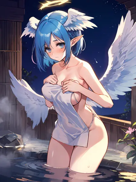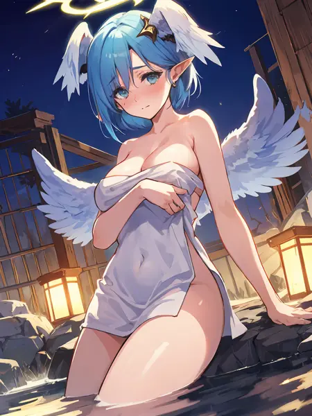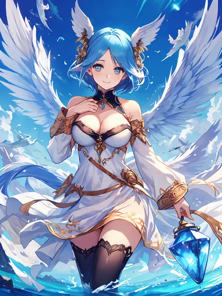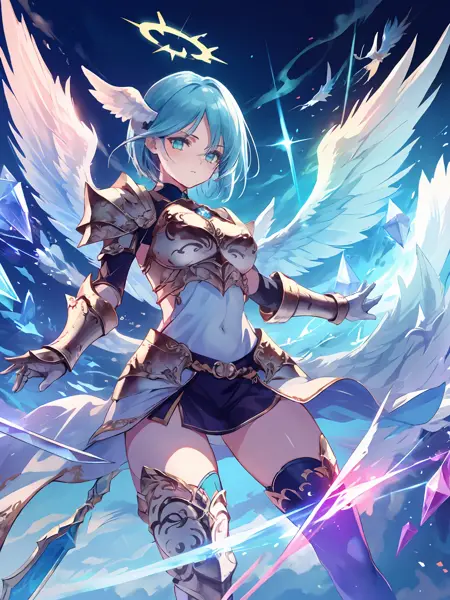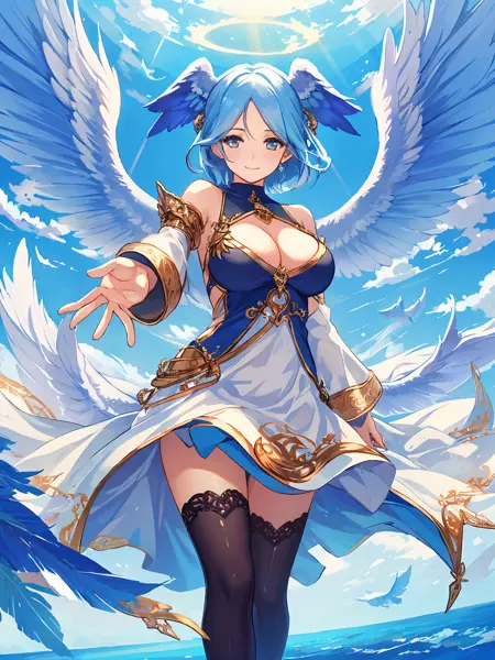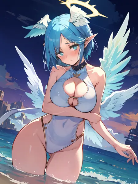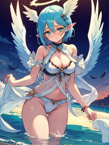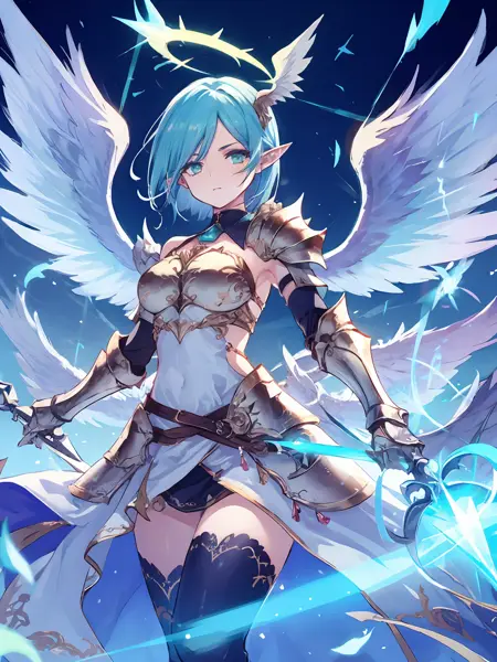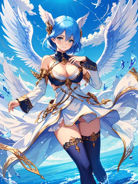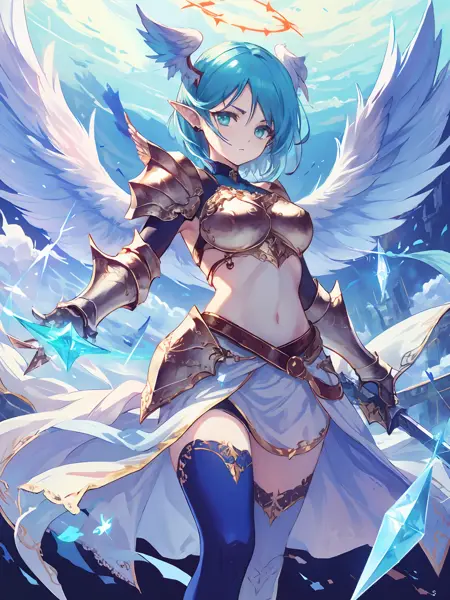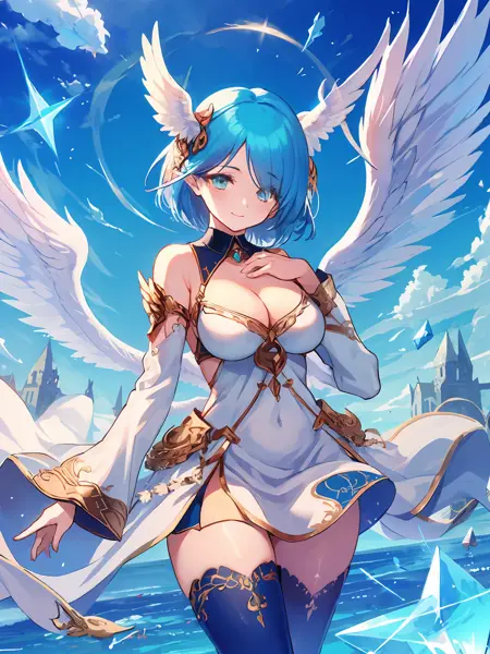 基础:蓝色头发,短发,头上的翅膀,发饰,水蓝色眼睛,翅膀,光环
