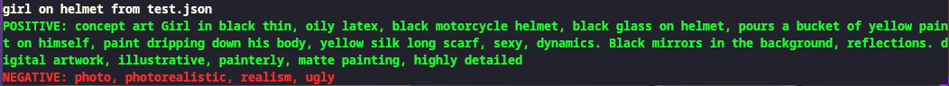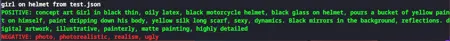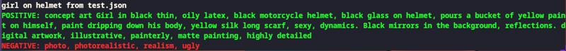 - ポジティブプロンプト: concept art Girl in black thin, oily latex, black motorcycle helmet, black glass on helmet, pours a bucket of yellow paint on himself, paint dripping down his body, yellow silk long scarf, sexy, dynamics. Black mirrors in the background, reflections. digital artwork, illustrative, painterly, matte painting, highly detailed