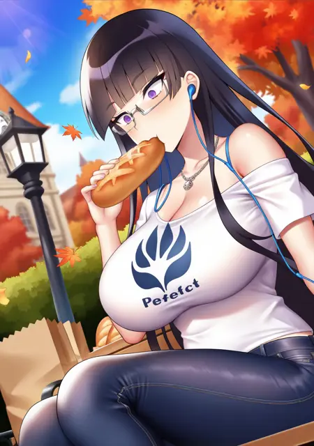 "huge breasts,long hair,black hair,blunt bangs, purple eyes"