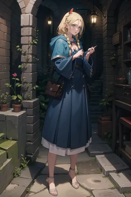 我没有将她的服装固定嵌入,所以如果你想让她穿上长袍,只需提示“robe”,也不要忘记使用“dmarci”这个关键词。
