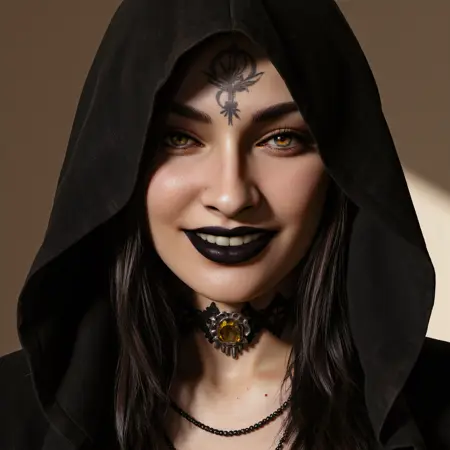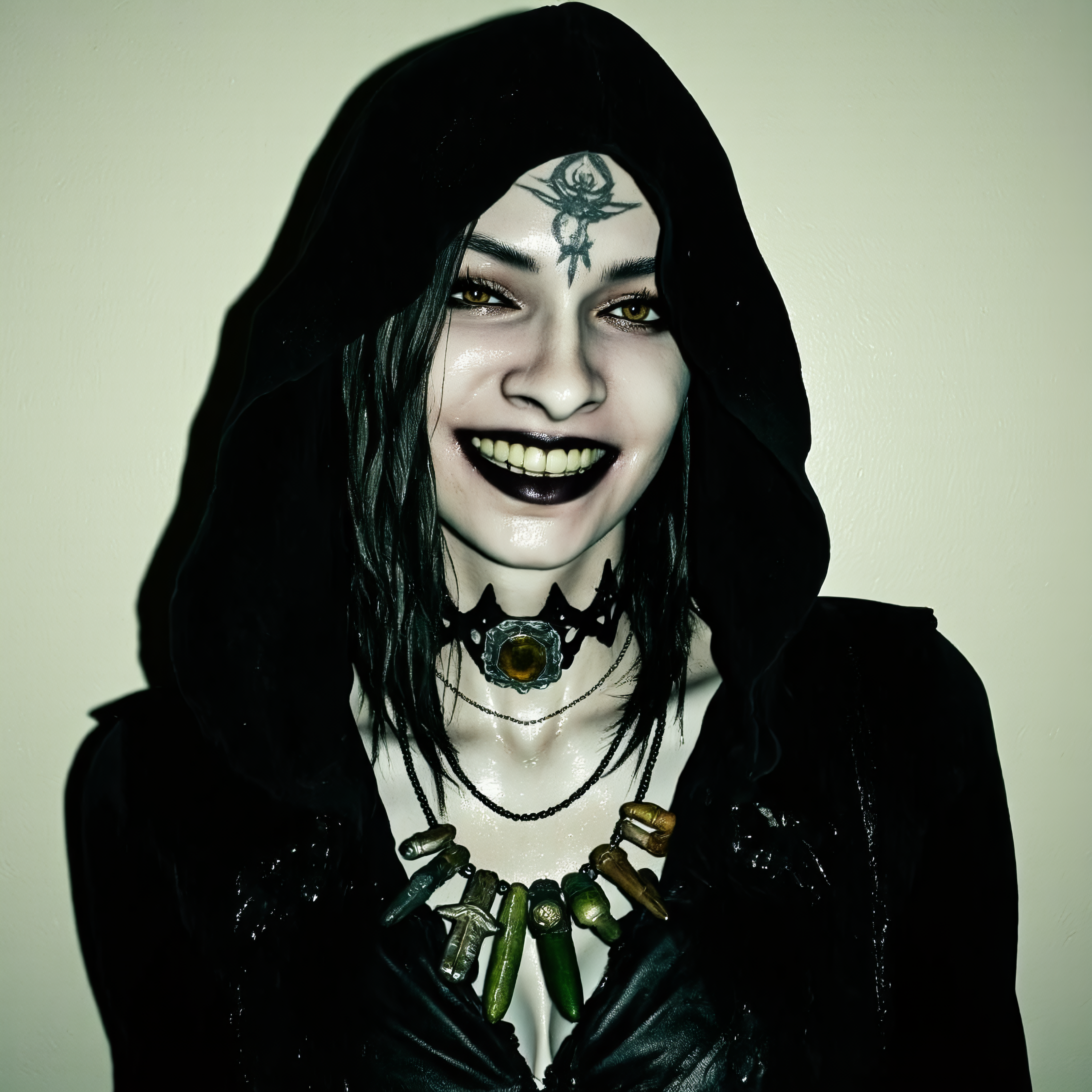 卡桑德拉·迪米特雷斯库,她有苍白的灰色皮肤,黑色头发,黑色嘴唇,额头上有纹身,戴着镶有黄色宝石的项圈,佩戴着饰物项链,身穿黑色哥特式长裙,戴着兜帽,露出邪恶的笑容,嘴角有血迹