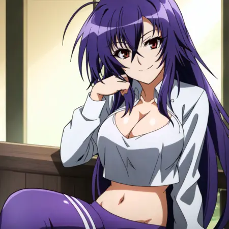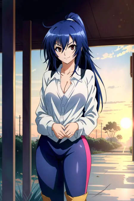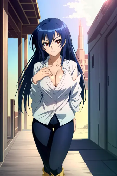 Medaka Kurokami, 1girl, solo, blue hair, long hair, breasts, shirt, ahoge, large breasts, open clothes, open shirt, red eyes, looking at viewer, cleavage