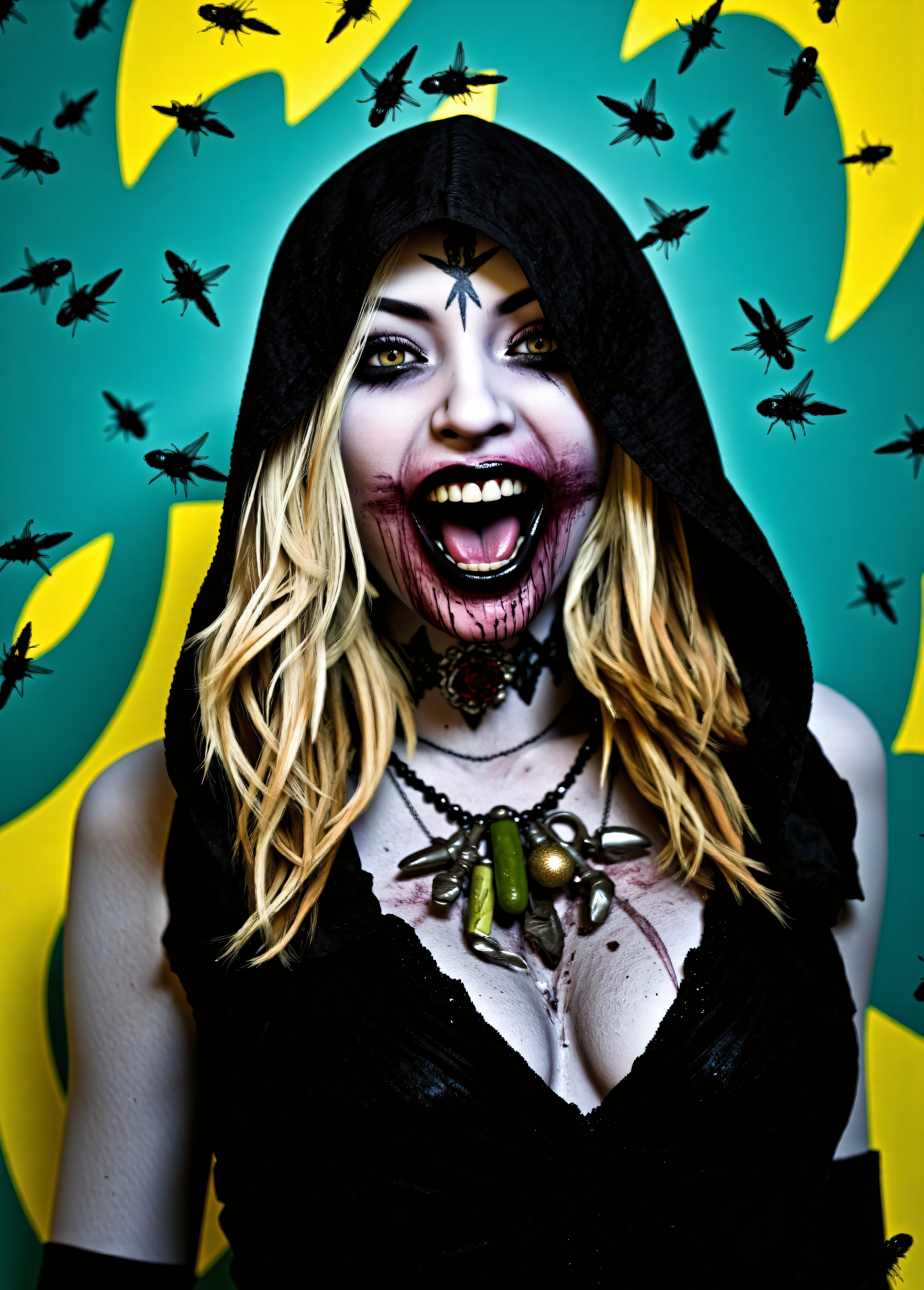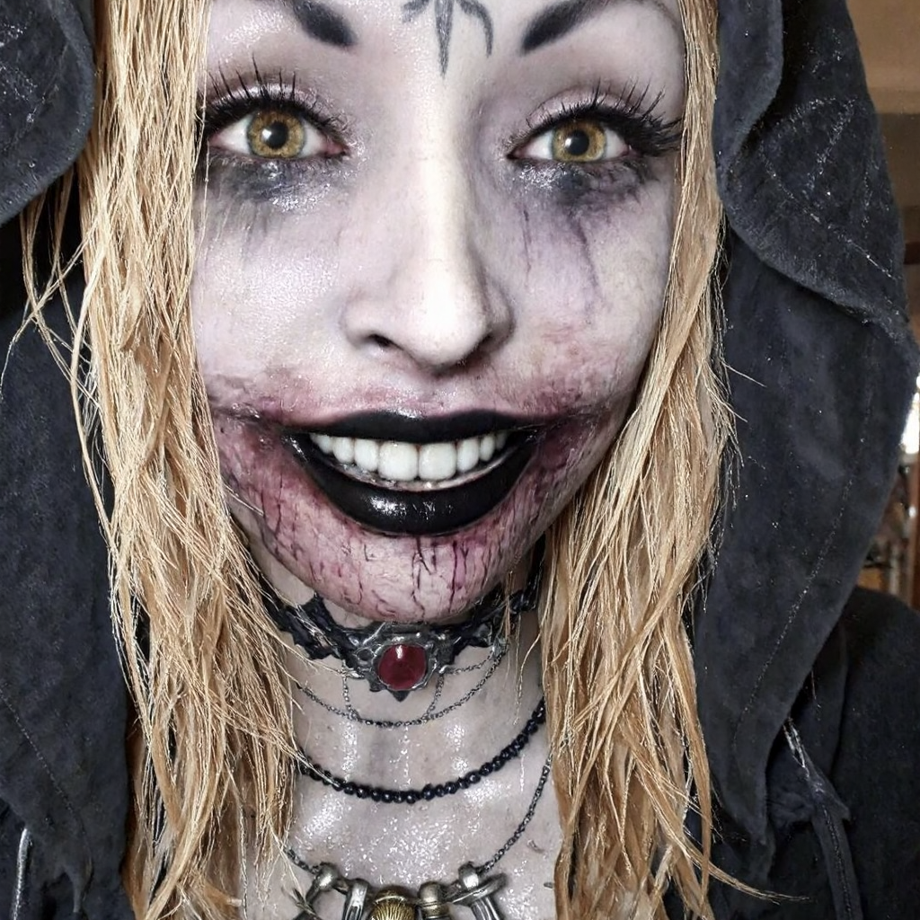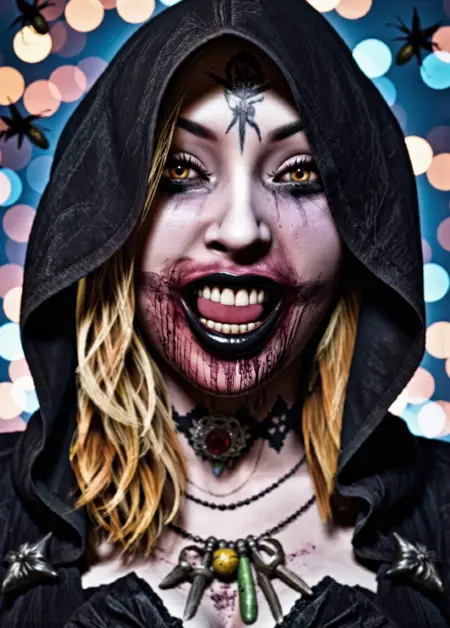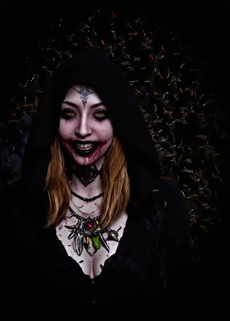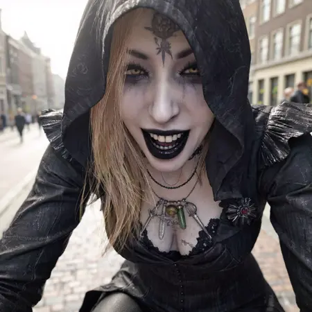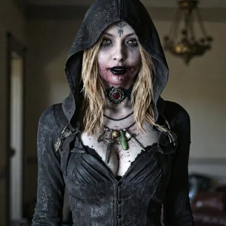 ベラ・ディミトレスク、彼女は薄い灰色の肌をしている(通常の肌色が欲しい場合は省略してください)、彼女は金髪で、黒い唇、崩れた黒いアイシャドウ、額にタトゥーがあり、まつ毛があります。赤い宝石がついたチョーカーを着用し、小物がついたネックレスを身に着けています。黒いゴシック風のドレスを着ており、フードをかぶっています。悪意に満ちた笑みで、口に血がついています。