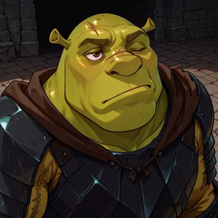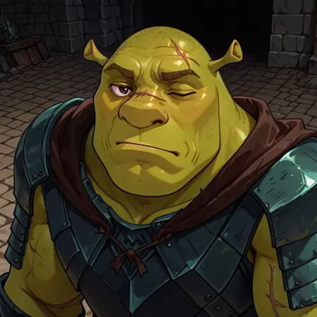 BerShrek-ILV1.0, armor, green skin, ogre, scar, one eye closed, shoulder armor, scar, colored skin,