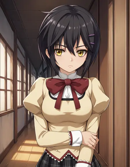 校服: pmmmkurekirika,紫色发夹,白衬衫,红色蝴蝶结领带,黄色套头毛衣(方形镂空),朱丽叶袖,白色袖口,黑色格子裙