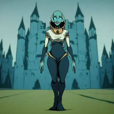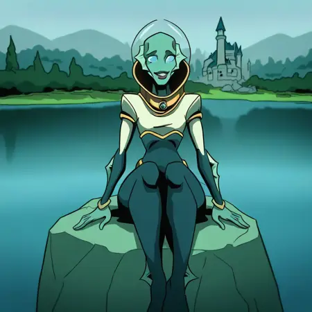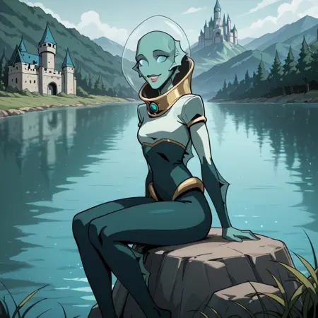 Nina_(Character), fish person, no pupils, blue skin, female, creature commandos uniform, glass helmet,