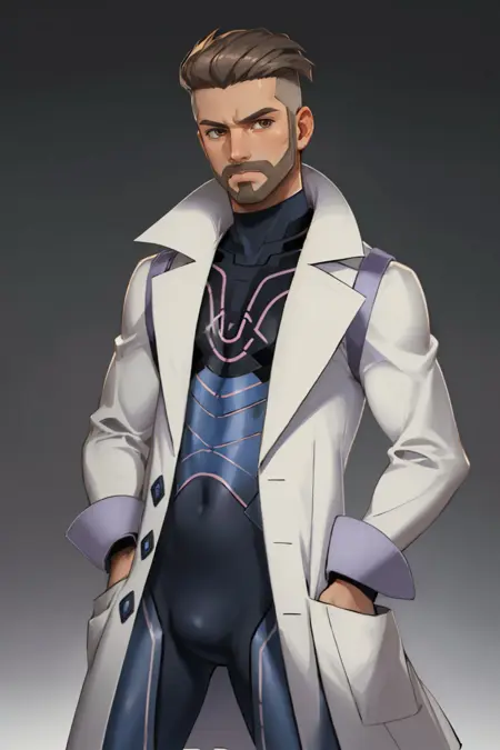 デフォルトの衣装: open clothes, labcoat, purple labcoat
