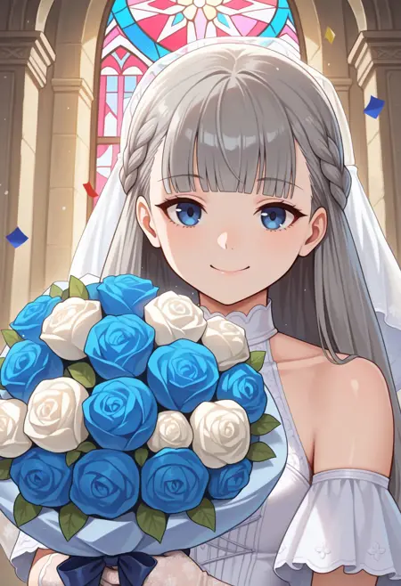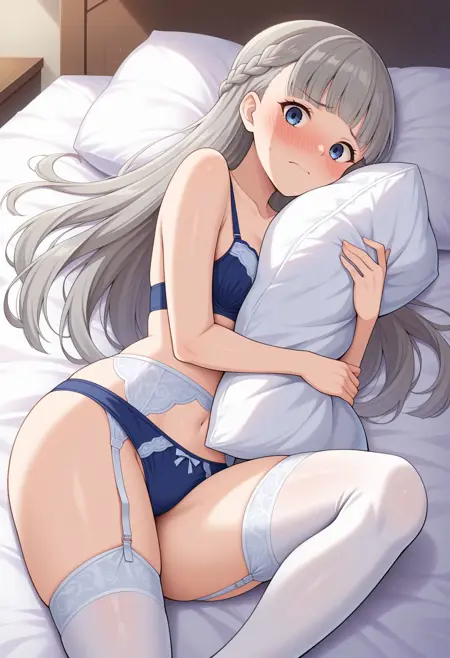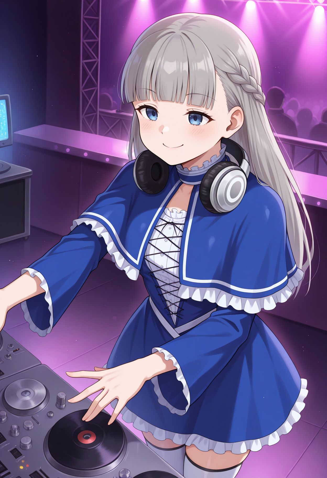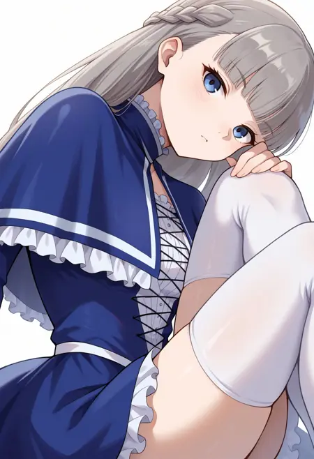 트리거: 1girl, long hair, blue eyes, braid, grey hair, blunt bangs, blue dress, long sleeves, frills, blue capelet, capelet, frilled dress, cross-laced clothes, frilled capelet, white thighhighs