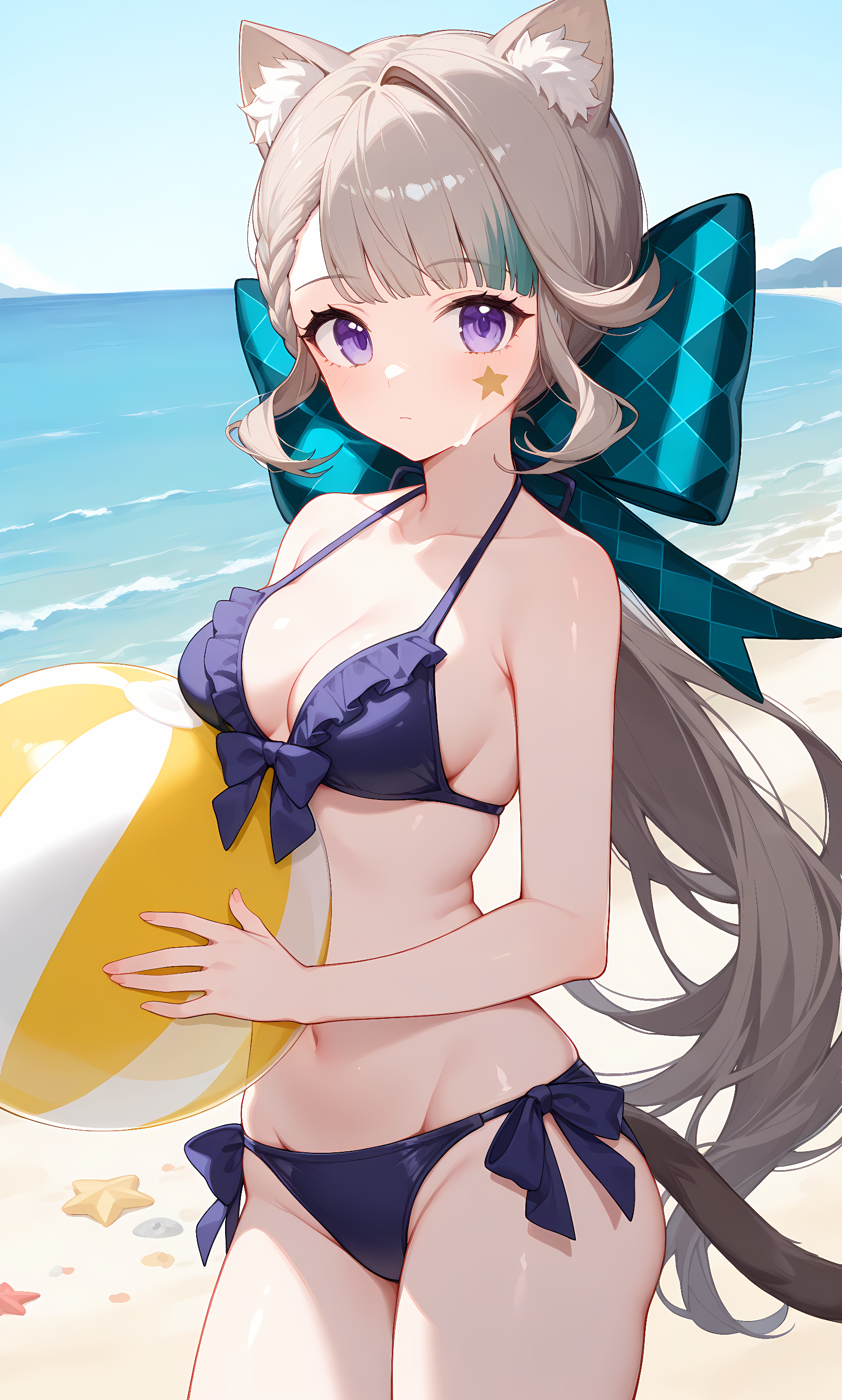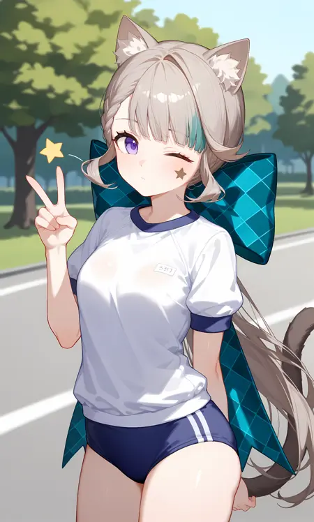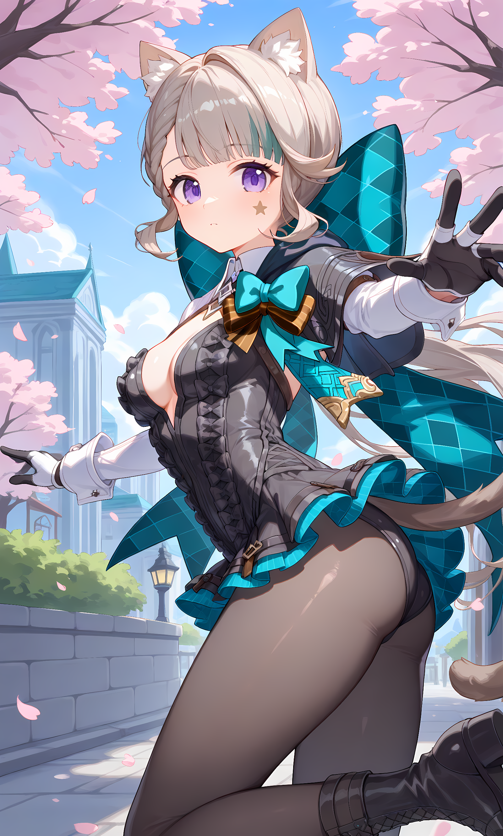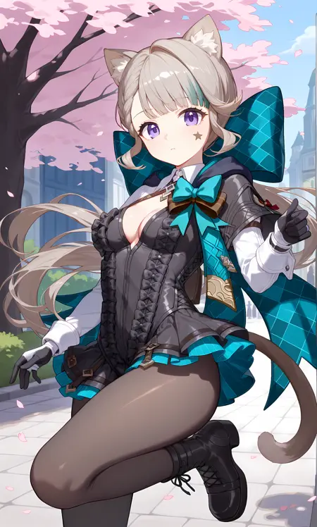 lynette (Genshin Impact)、動物の耳、猫の耳、紫の目、リボン、顔の模様、長い髪、猫の尾、灰色の髪、動物の耳のふわふわ、アクア色のリボン、編み髪