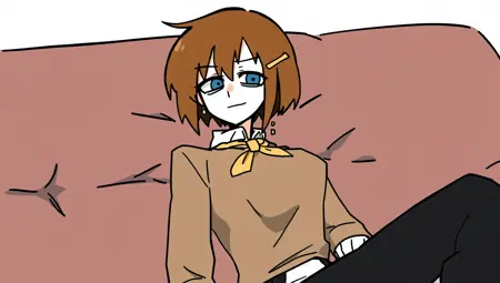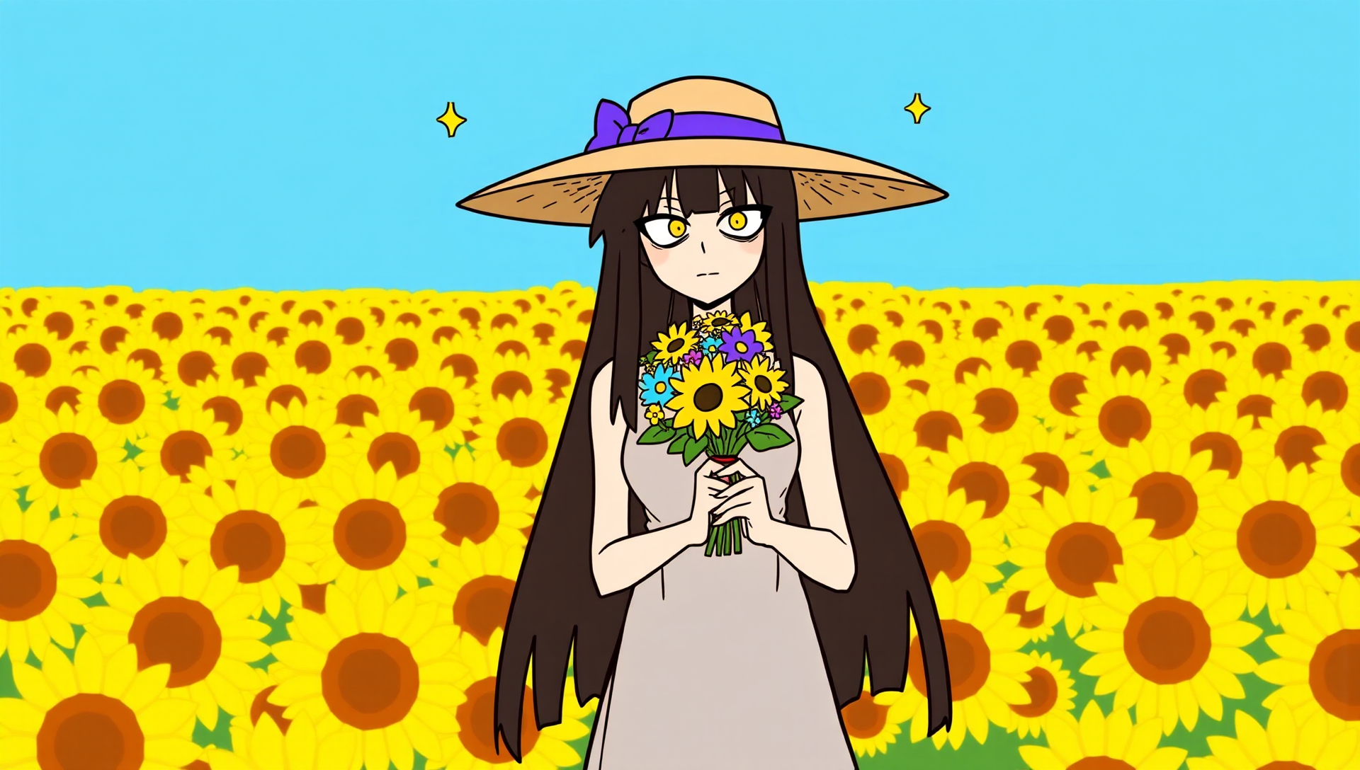 A young woman with very long, straight purple hair and bright yellow eyes stands solo, looking at the viewer. She wears a sleeveless grey sundress adorned with a blue ribbon and a large bow at the collarbone. On her head, she has a straw sun hat decorated with a purple bow and a yellow flower. In her hands, she holds a bouquet of sunflowers, adding a cheerful touch to her outfit. At the background is a wall of sunflowers of a sunflower field --profile uez86ay --stylize 150 --niji 6