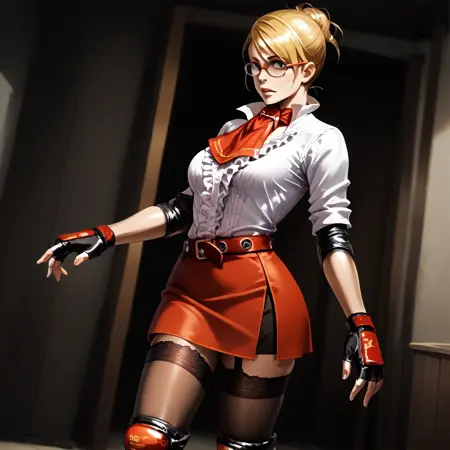 服装 - 花边衬衫、卷起的袖子、红色领结、裙子、腰带、肘部护具、蕾丝长筒袜、膝部护具、交叉系带鞋、内裤、眼镜