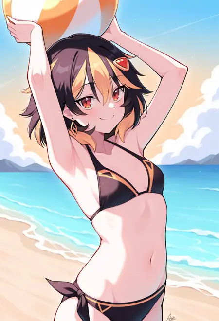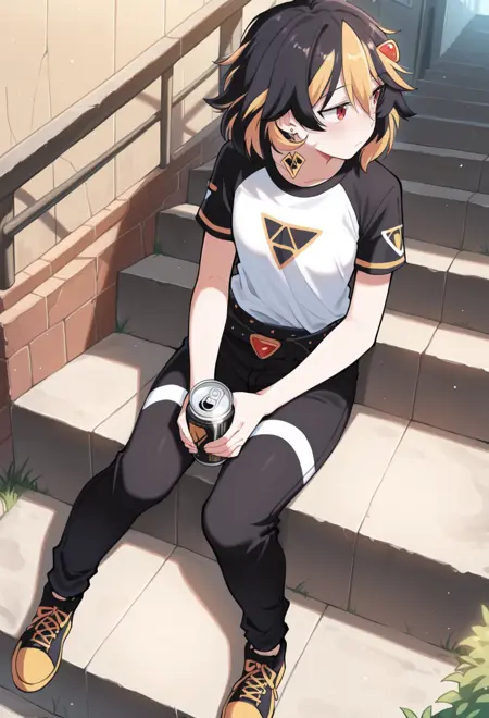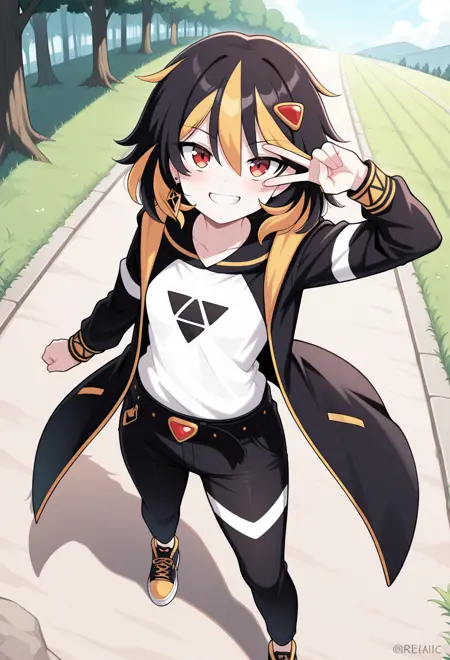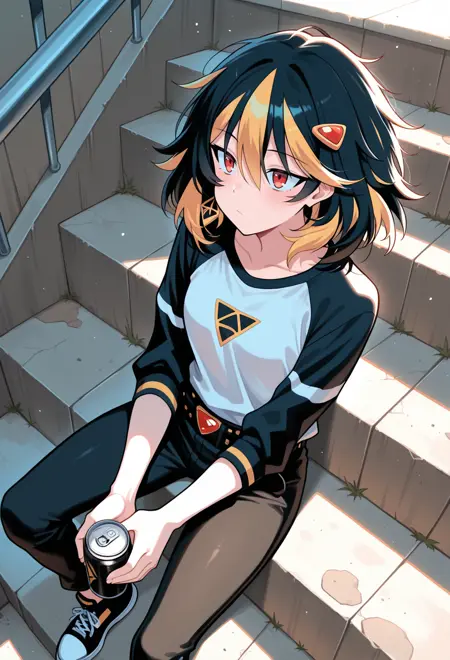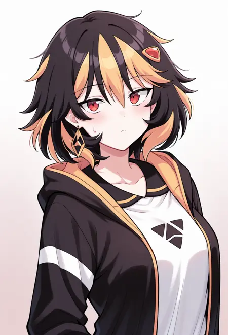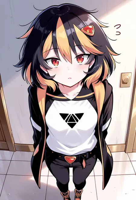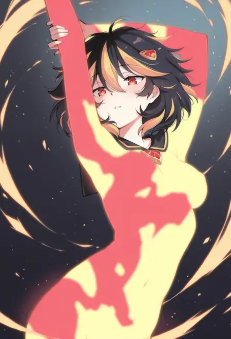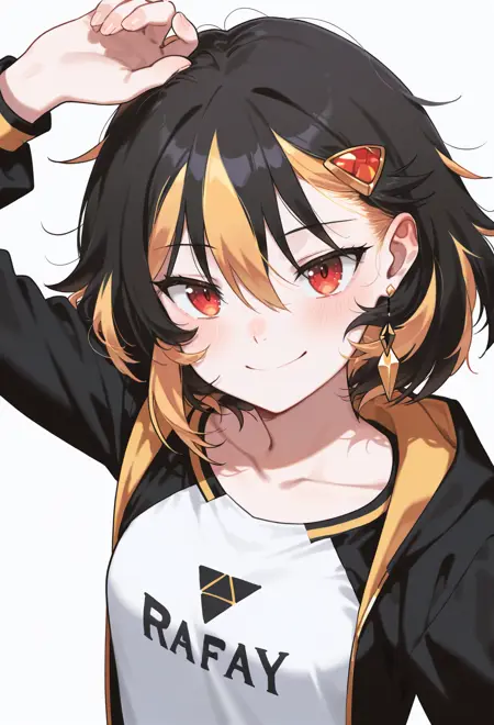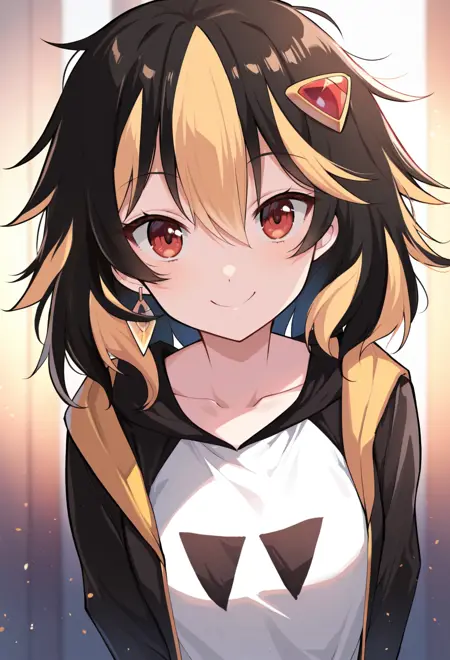 赤い目、ストライプ模様の髪、黒髪、金髪、マルチカラーの髪、乱れた髪、ミディアムヘア、小さな胸、髪飾り、ヘアクリップ、