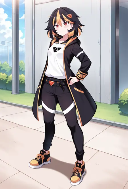 黒いコート、長袖、オープンコート、黒いフーディー、フードを下ろした状態、白いシャツ、プリントシャツ、ラグラン袖、黒いベルト、複数のベルト、黒いズボン、黒い靴、スニーカー、