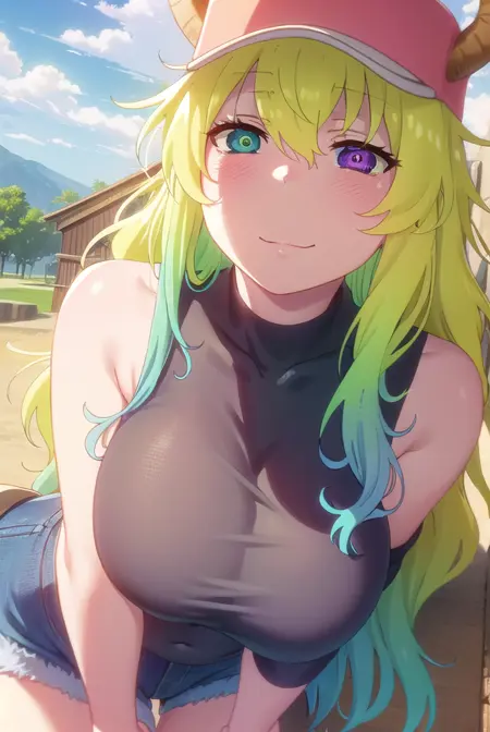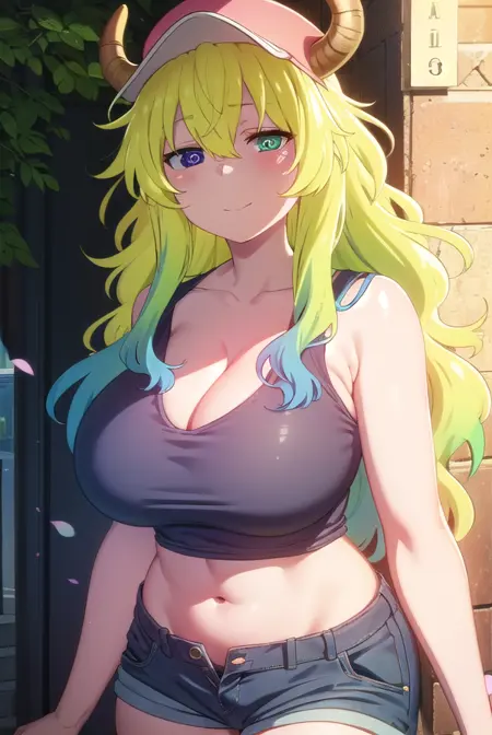 lucoa、ブロンドの髪、青い髪、ドラゴンの少女、グラデーションの髪、緑の髪、額の間の髪、角、装飾品を通した角、(巨大な胸:1.2)、マルチカラーの髪、ベースボールキャップ、キャップ、帽子、緑の目、(紫の目:1.2)、黄色い瞳、(不一致な虹彩:1.2),