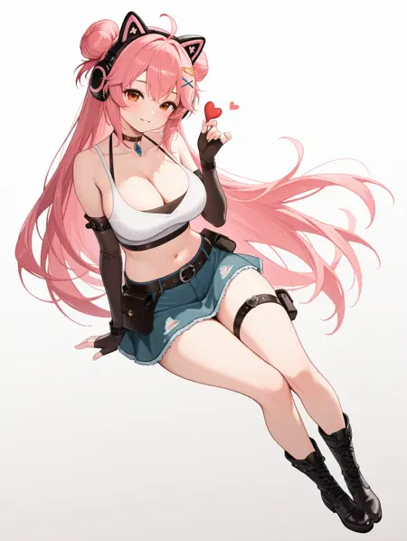 ruri, 1girl, 单人, 长发, 大乳房, 衬衫, 发饰, 红眼, 肚脐, 裸肩, 极长发, 白色衬衫, 粉色头发, ahoge, 靴子, 分离袖子, 黑色手套, 发夹, 肘部手套, 皮带, 迷你裙, 露指手套, 发髻, 黑色鞋履, 短上衣, 无袖衬衫, 大腿绑带, 假动物耳朵, 黑色项圈, 皮带包, 动物耳朵耳机, 猫耳耳机