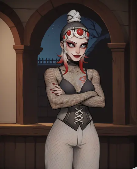 head bandana, fishnet top, black bra, off shoulder leather jacket, corset, pants, or scaley pants,