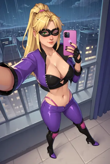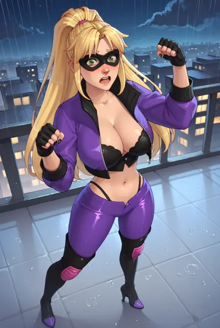 long sleeves, navel, cleavage, cropped jacket, purple jacket, black gloves, fingerless gloves, black footwear, open jacket, thigh boots, high heel boots, knee pads, leggings, purple footwear, sleeves past elbows, domino mask, purple pants, eye mask, stiletto heels, highleg panties, pantylines, superhero outfit