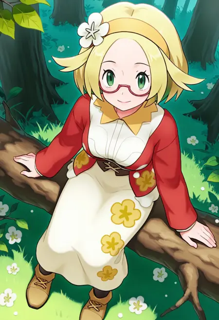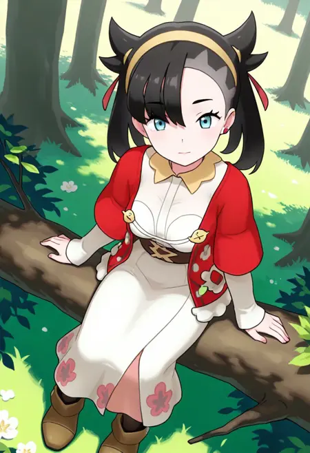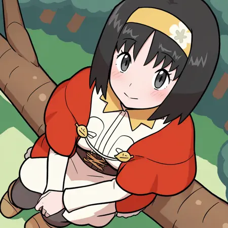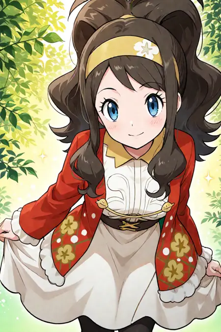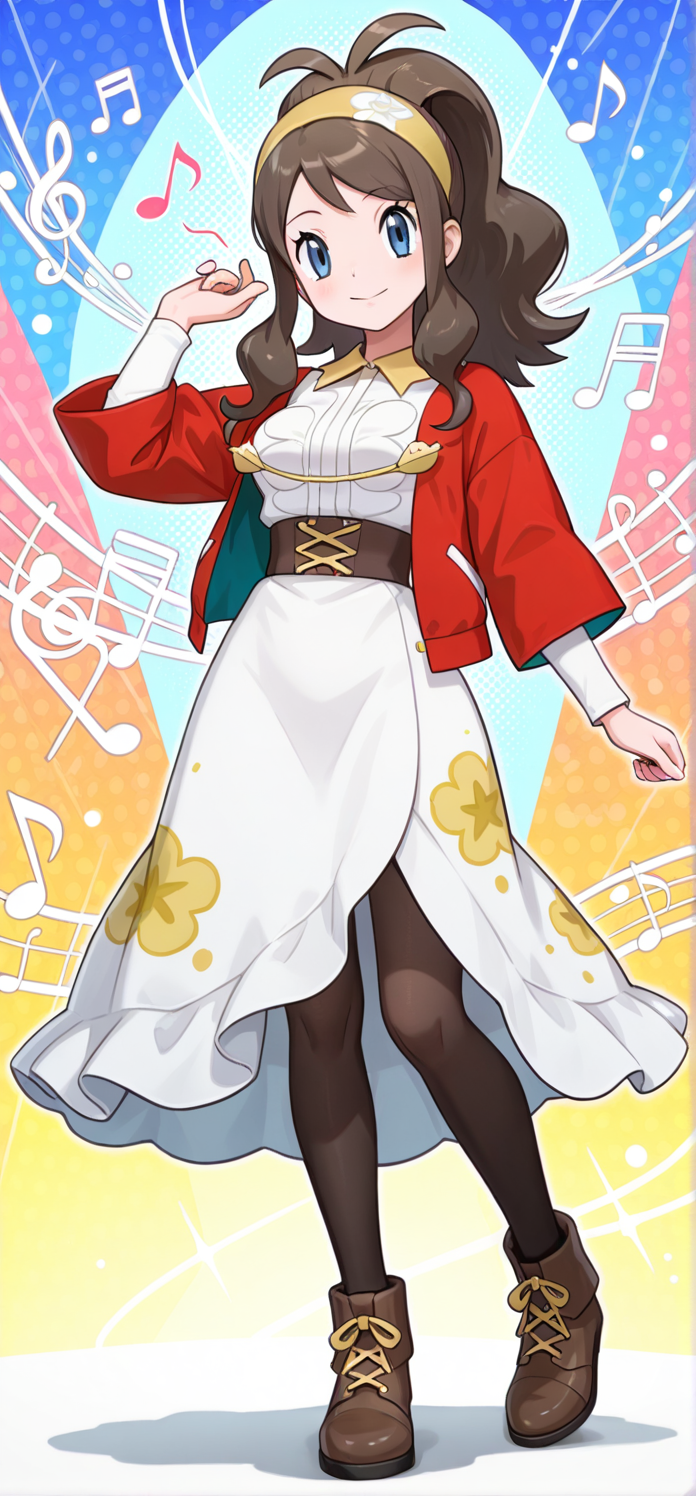 yellow hairband, white dress, collared dress, long dress, brown sash, long sleeves, red jacket, floral print, black pantyhose, ankle boots, brown footwear